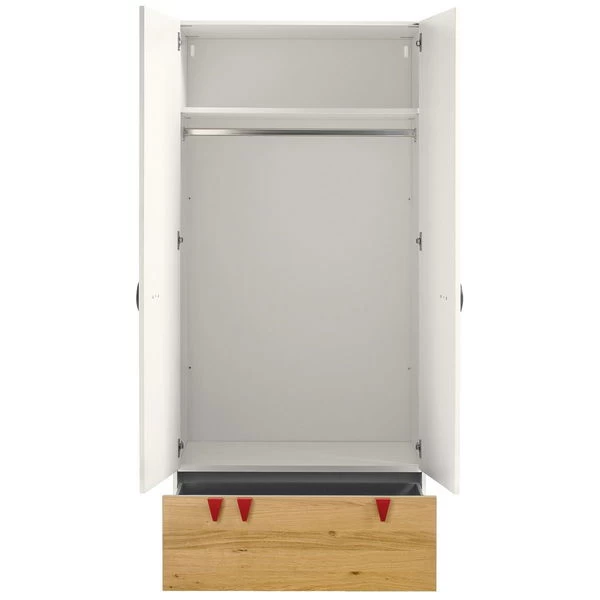 Der Kleiderschrank ist mit 2 Türen und 1 Schublade mit gedämpftem Selbsteinzug ausgestattet. Innen befinden sich 1 Einlegeboden und 1 Kleiderstange.