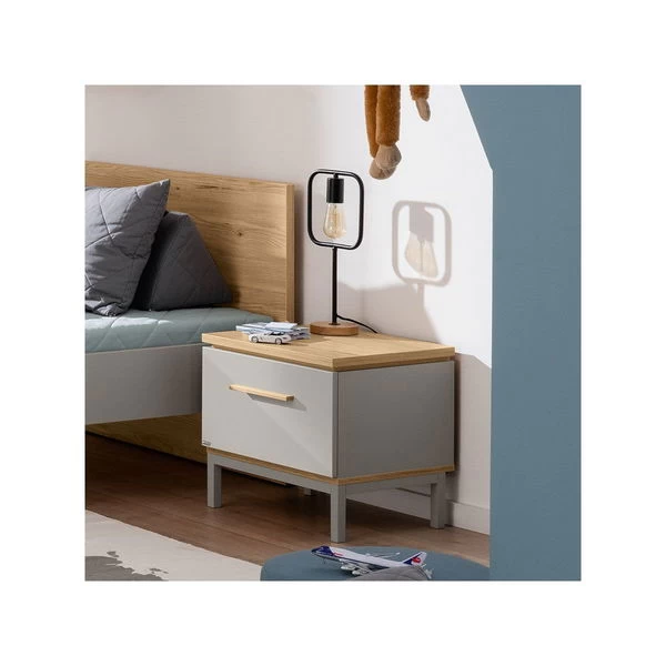 Der Paidi Benne Nachttisch hat einen Schubkasten in kieselgrau und fügt sich harmonisch in das Zimmer ein. Deckplatte und Sockel sind in Eiche-Montana-Nachbildung abgesetzt, der Griff ist aus Eiche massiv.