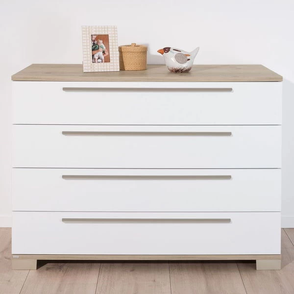Die Paidi Kommode ist mit 4 Schubkästen (mit Facheinteilung) in kreideweiß ausgestattet. Es können wahlweise eine oder zwei Schubkastenfronten in Fichte-Vintage-Nachbildung geliefert werden. Der obere Schubkasten ist immer kreideweiß und hat einen Vollauszug. Der im Preis enthaltene Wickelaufsatz bietet eine Wickelfläche von 84,2 x 76,5 cm. In die Schubkästen kann ein Schubkasten-Einsatz eingesetzt werden, dieser wird weiter unten als Variante angeboten.