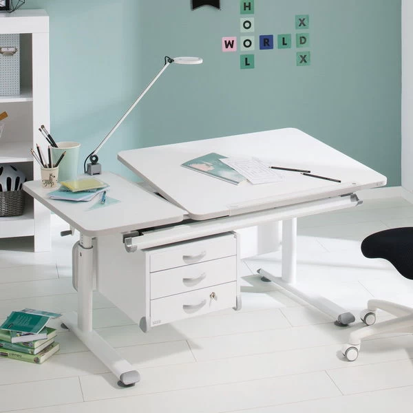 Ein perfekter Platz für die Hausaufgaben im angesagten Design – der Paidi Diego Schreibtisch in kreideweiß mit grau abgesetzten Details unterstützt jeden Lerntyp mit praktischen Ausstattungsmerkmalen.