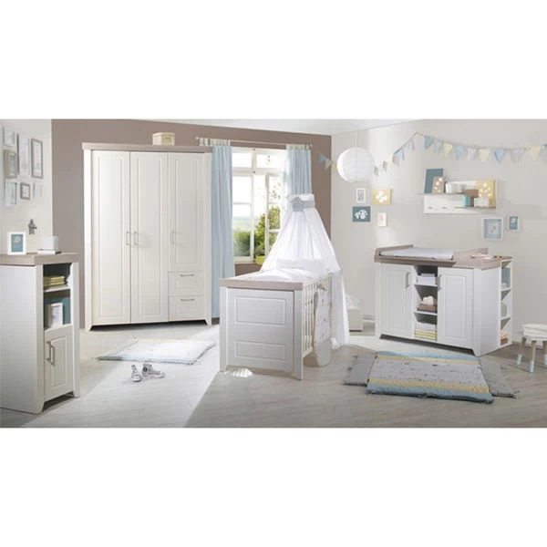 Das Roba Felicia Kinderzimmer lässt mit seiner Kombination aus modernem Weiß mit dezenten Holzabsetzungen die Herzen von Eltern und Kindern höherschlagen. Mit schickem Fässungen an den Fronten wirkt das Kinderzimmer zudem gleich viel gemütlicher und versprüht einen eleganten Landhausstil.