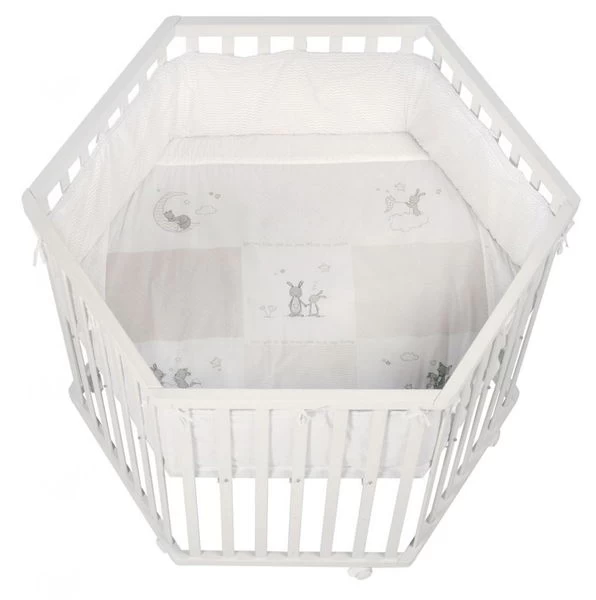 Das Roba Laufgitter 6-eckig ist ein kindgerechtes stabiles Laufgitter mit Flachstäben aus Holz in modernem Dekor. Aufgebaut bietet das Roba Laufgitter 6-eckig eine große Spiel- und Kuschelfläche mit einer liebevoll gestalteten Stoffeinlage für Rundumschutz. Die rückenfreundliche 3-fache Höhenverstellbarkeit lädt Eltern mit Freude zum Spielen mit ihren Babys ein. Rollen sorgen für die nötige Mobilität. Ein wunderschöner, sicherer Spielplatz, der lange Verwendbarkeit garantiert und in dem Kinder gerne die Welt entdecken.