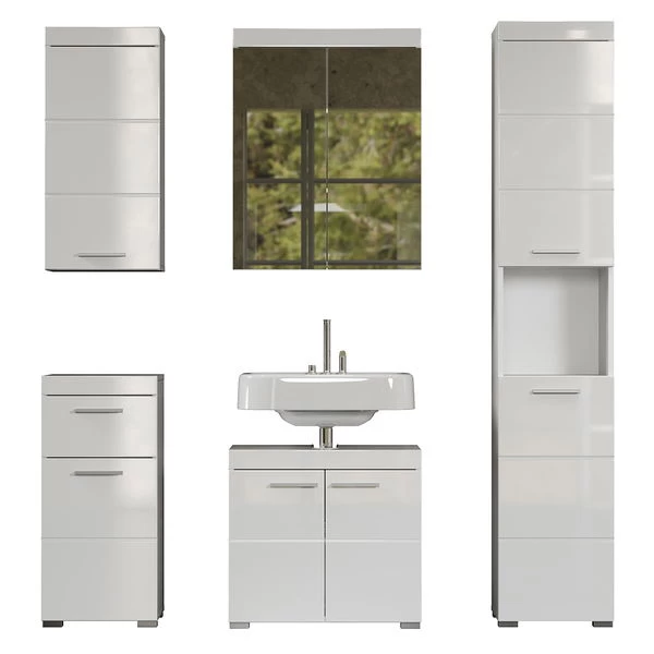 - bestehend aus Hochschrank, Waschbeckenunterschrank, Spiegelschrank, Hängeschrank und Standschrank