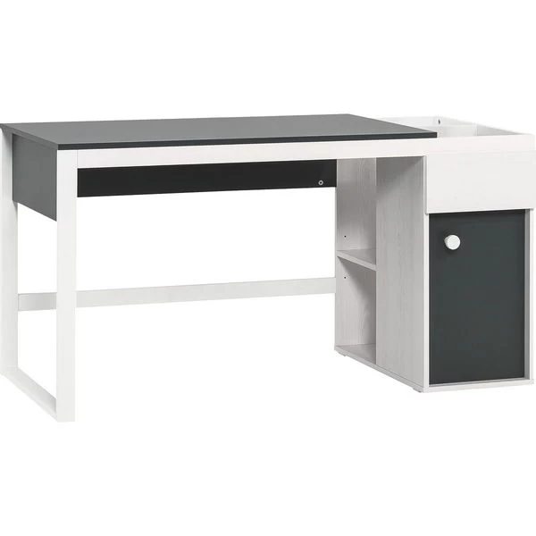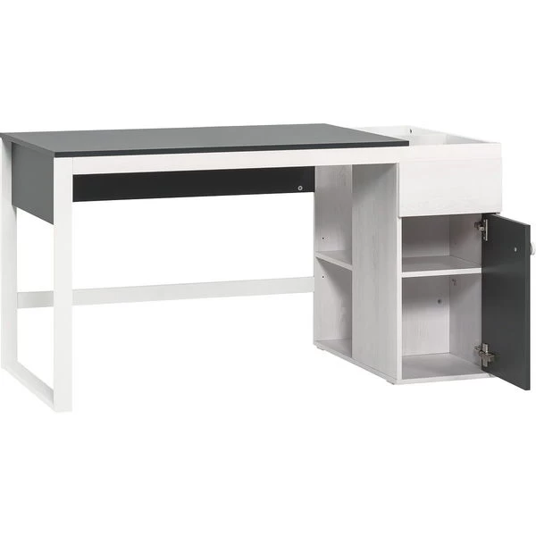 Der VOX Nest Schreibtisch ist elegant, modern und sehr funktional. Rechts im vorderen Teil oben ein Organizer, darunter eine Schublade und unten hinter der Tür ein Schränkchen mit einem regulierbaren Einlegeboden. Rechts im hinteren Teil ein offener Stauraum (z.B. für Papierkorb) und darunter ein offenes Fach (z. B. für Bücher oder Hefte). Schublade ist au hochwertigen Quadro-Gleitschienen montiert, die für müheloses Öffnen und Schließen sorgen. Schublade und Tür sind mit Soft-Close-System ausgestattet. Zum Schreibtisch ist auch eine moderne LED-Beleuchtung erhältlich, die zusätzlich bestellt werden kann.